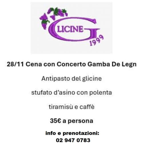 28 Novembre - Cena e concerto al Glicine info e prenotazioni: +39 02.947 0783 Sabato 20 Dicembre - Old Band Magenta